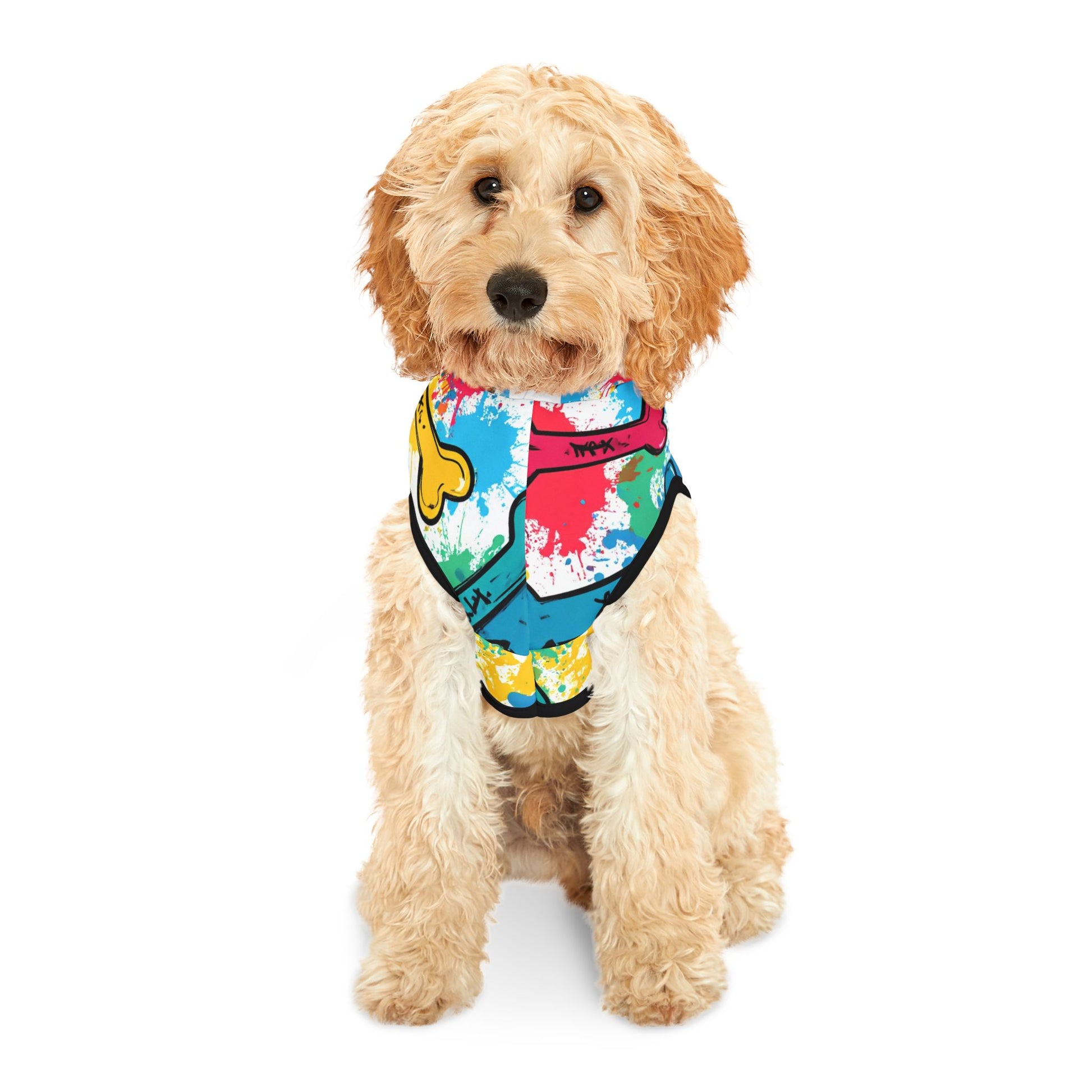 Colorful Graffiti Pet Hoodie with bone print exuding a playful and vibrant vibe, perfect for pet owners looking to keep their furry friends stylish and cozy. Ideal for pet lovers celebrating their pet's birthday or looking to spoil them with a fun accessory.
